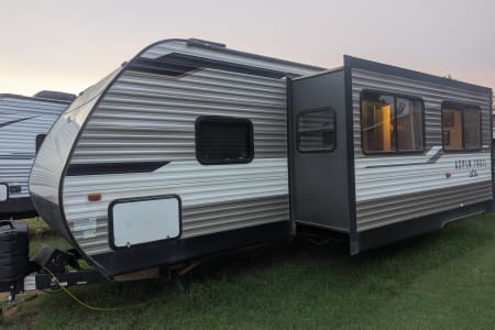 This 29' camper boasts dual AC units, a kitchen stocked with essentials, and an outdoor kitchen. Bedding and linens, are provided to make your stay a breeze!
