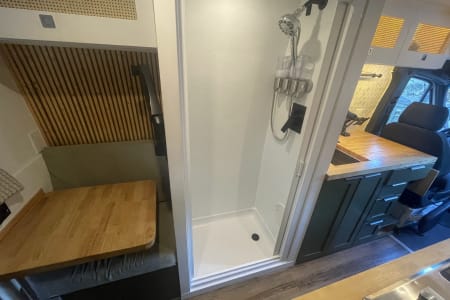 Don’t be fooled by the warm interior—this van is ready for off-grid living, supporting 1.5–2 weeks of boondocking for two. Designed with digital nomads in mind and a heart for adventure, she is equipped to support two dual full-size monitor workstations for seamless remote work and features a fixed bed leaving ample “garage” space for all your toys and gear.