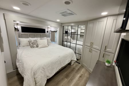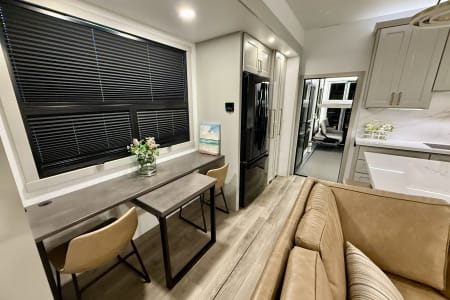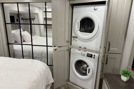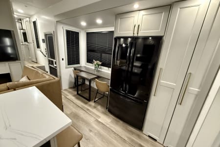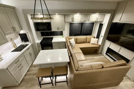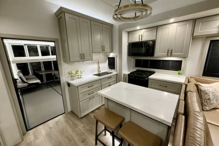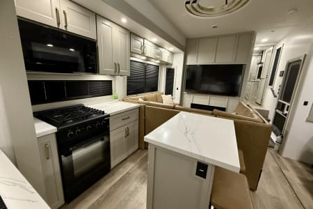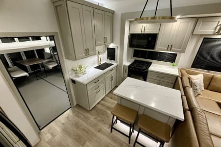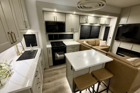 Inside you’ll find a full residential-style kitchen with a 19 cu ft Energy Star refrigerator (filtered water & ice maker included), convection microwave/air-fryer combo, and four-burner range—ideal for creating meals on the road.