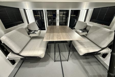 The living area is outfitted for lounging and socializing, while thoughtful touches like window-integrated day-screens, blackout shades, and a carpet-free pet- and kid-friendly floor show it’s built for real-life use.