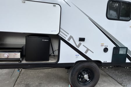 The 2022 Forest River Ozark Lite 1680BSK is a lightweight, single-axle travel trailer designed for easy towing and comfortable camping, featuring a versatile interior with double-size bunks and a Murphy bed that converts to a sofa. Key amenities include a slide-out with a U-shaped dinette, a full bathroom, a kitchen with a refrigerator and stovetop, and an exterior power awning with an outside griddle and shower.