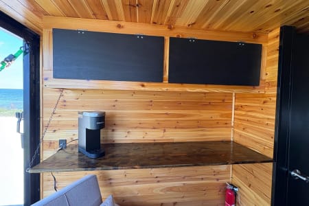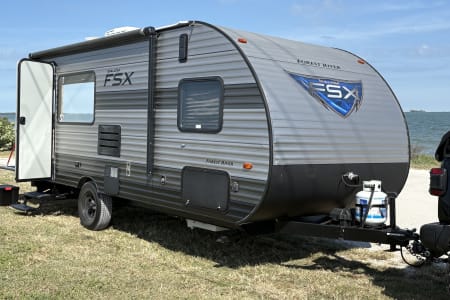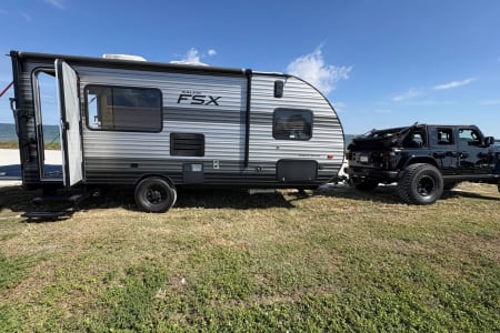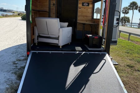 My Toy Hauler is designed to get you there in comfort. It will haul up two maybe three motorcycles - the floor has tie downs istalled. The full size mattress is new and extremely comfortable. You have everything you need to stay happy - cold AC, hot heat in the winter. Gas water heater, hot water shower, bathroom, kitchen sink with gas stovetop, refrigerator, freezer, USB ports, microwave. This Toy Hauler weighs in around 3200 lbs dry and is very easy to tow and with its back up camera system parking is a lot easier. I do have a few hitches you can pick from - the ball size is 2 5/16 and it uses the standard round connector. All the hoses needed for the dump station are included along with other amenities. Fishing rod, lounge chairs.