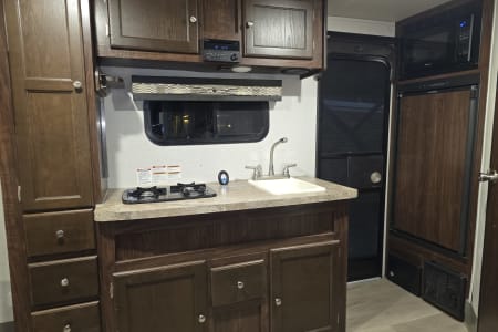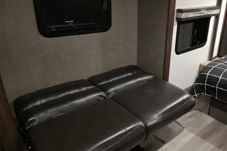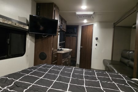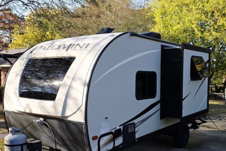 Take a trip in this 21ft mobile executive sweet. This 2018 Forest River Palomino Palomini is equip with all the comforts you'd want for your outdoor excursion (BTW, her name is DEB). First, at 21ft long you can take her just about anywhere. Me and Deb have traveled everywhere from the coastlines of South Padre Island, TX to the woods and lakes in the great state of Alabama. Deb is equip with a cold overhead AC and heater. She's got a nice queen size bed and a soft leather dining seat that converts to another bed. I personally only used her for myself and 1 other guest but you can sleep 3 adults comfortably. Deb is 10ft wide but she has an push button operated extension that will make your dining area a lot more spacious. Deb also has a cozy and private bathroom with a cute toilet, sink, and shower. In the dining area you'll enjoy a complete kitchen that includes an electric/propane grill, kitchen sink, mid-sized fridge/freezer, microwave oven, and plenty of cabinet spaces. Speaking of spaces. Deb has lots of storage room. Starting with cabinets above the queen size bed, his and hers closets on each side of the bed and additional storage at the base of the bed. You also have storage space for your gear on the outside of Deb that is accessible at the front with a key. For your entertainment needs, Deb is equip with a 20inch flat screen smart TV and a Bluetooth ready stereo system located above the grill in the kitchen. You have the option of activating the external or internal built in speakers. You can also have them playing inside/outside at the same time. Additionally, Deb has a rollout awning to shelter you from the Sun or rain. I recently upgraded Deb with blackout window covers for max privacy and custom floors. Like I said, Deb is a very comfortable mobile suite. I really hope you enjoy her.