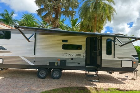 Enjoy the freedom of outdoor living in this beautiful and almost new 2022 Dutchmen Colorado travel trailer, perfectly set up for a cozy tropical getaway.