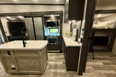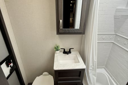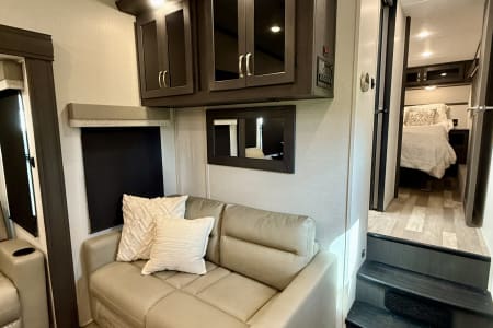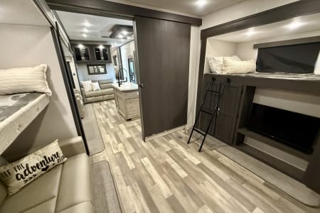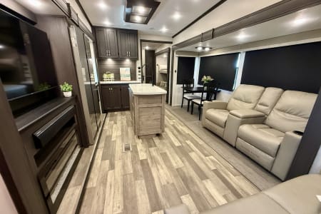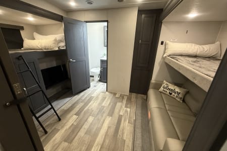 Inside, you’ll find upscale finishes like walnut accent walls, blackout roller shades, designer lighting, and a 4 K smart TV with a soundbar.