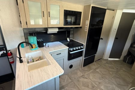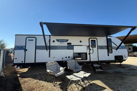 Inside, you’ll find a cozy living space, comfortable sleeping areas, a fully functional kitchen, and a bathroom for added convenience. We keep the RV clean, well-maintained, and ready for your adventure.