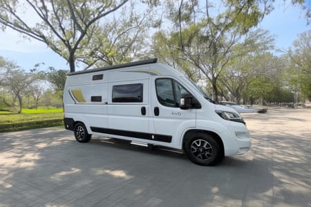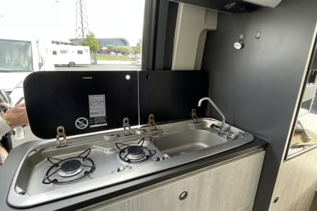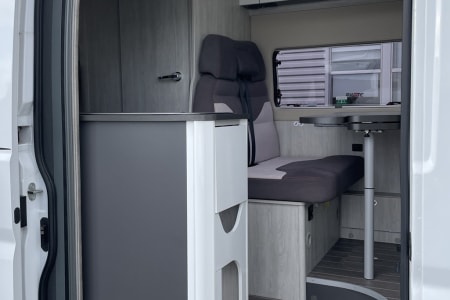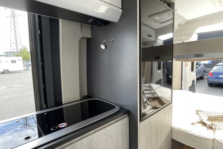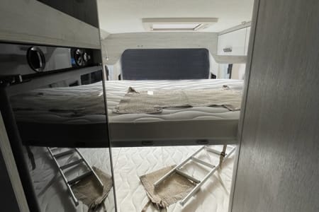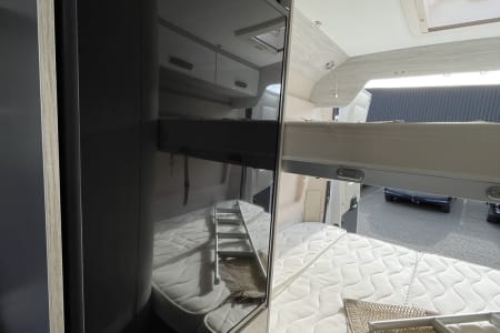 Le fourgon aménagé CI Kyros 5 offre 4 couchages, à bord d’un fourgon de moins de 6 mètres de long (5,99 m). On trouve donc à l’arrière de ce Fiat Ducato deux lits doubles superposés de bonne taille (186×144 cm et 186×132 cm). De quoi dormir à bord à 4 personnes, et faire ainsi correspondre le nombre de couchagEs au nombre de places route du véhicule.
