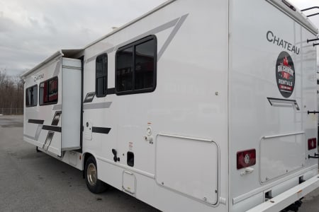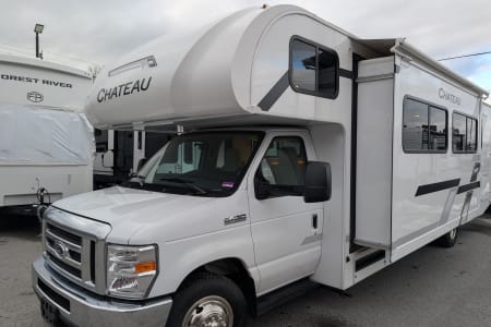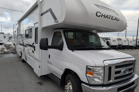 Experience a smooth ride to each destination with the Thor Motor Coach Chateau Class C gas motorhomes! There is a Ford E-Series chassis and each model includes an 8,000 lb. trailer hitch to bring the family car along. They are constructed with a welded tubular aluminum roof, sidewall cage construction, vacu-bond laminated roof, walls, and floor with block foam insulation to keep the heat and air conditioning inside. The slick fiberglass exterior with graphics package and black framed windows are sure to turn heads down the highway too. Inside, you'll be met with residential vinyl flooring, premium window privacy shades, a power bath vent, and pressed laminate kitchen countertops. There is even a tankless water heater for endless hot showers, a 4.0 kw dual gas/LP generator to keep you going, and a 100-watt solar charging system for off-grid capabilities!