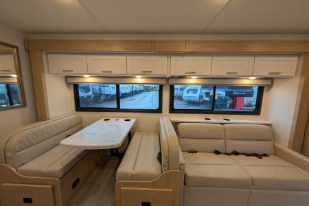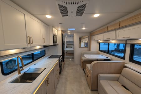 You and your spouse can go on your best adventures in this motorhome! You will have great views out of the many windows when you are indoors, and the power awning offers an outdoor living area protected by the elements when you want some fresh air. The cook will love the large single bowl stainless steel sink with a single handle faucet with a pull-down sprayer when cleaning fruits and veggies, the gas cooktop and microwave when making meals, as well as the 12V refrigerator to hold all the cold items. The slide out creates even more floor space, the 71" Dream Dinette and 66" jackknife sofa offers a place to dine and visit as well as sleep, and the rear private bedroom with a full bathroom just steps away will complete the deal! You will also appreciate the optional exterior TV to watch your favorite shows while breathing in fresh air!