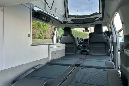 La nuit, la banquette arrière se convertit en un deuxième couchage double, afin de pouvoir dormir jusqu’à 4 personnes.