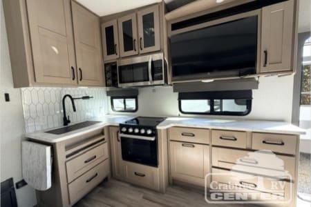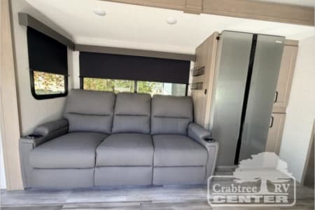 With any Reflection 150 Series fifth wheel by Grand Design, there is more available payload capacity and a broader range of half-ton trucks capable of towing this fifth wheel, and no slider hitch is needed thanks to the 90-degree turning radius which makes them short bed friendly and easier to tow. The mandatory Ultimate Power package provides a "One-Touch" automatic leveling system and a detachable power cord with LED light for easy setup, plus motion sensor pass-through lighting and entry lighting, and the Tire Linc TPMS will help you stay safe on the road. The interior offers residential luxury from the cabinetry and premium Congoleum flooring, to the booth dinette and residential-style window treatment. Make your refined decision today!