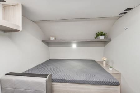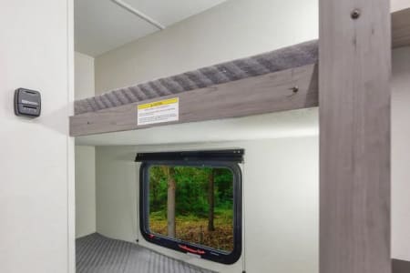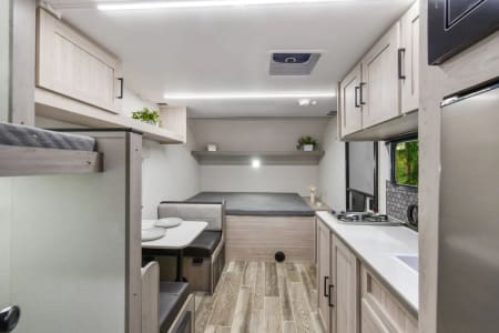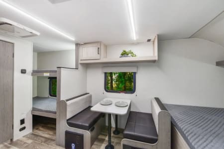 ✔ Sleeps up to 5–6 (Queen bed + convertible dinette + bunks)