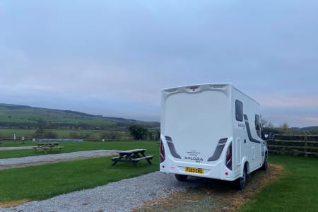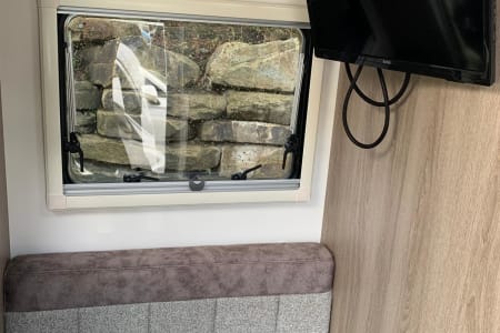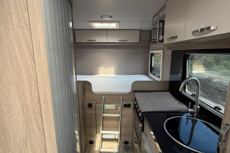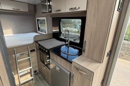 The separate bathroom has a shower, sink with mixer tap & cassette toilet with elecric flush. A generous 75l fresh water tank gives you plenty of water on tap.