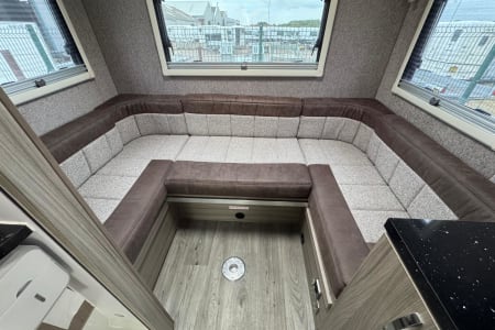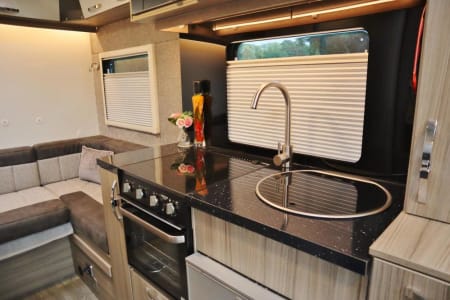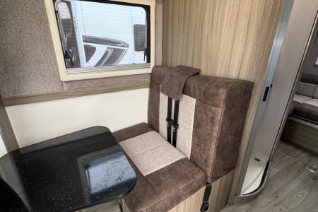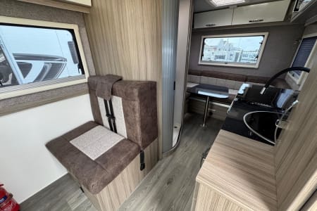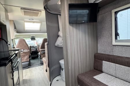 The separate bathroom has a shower, sink with mixer tap & cassette toilet with elecric flush. A generous 75l fresh water tank gives you plenty of water on tap.