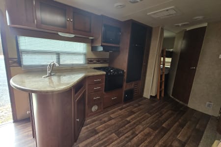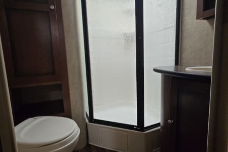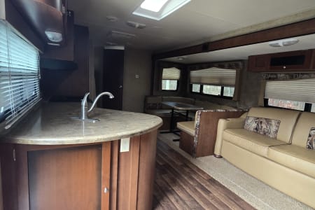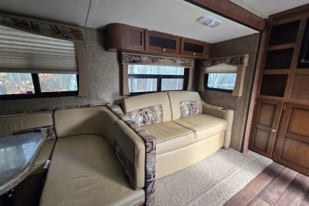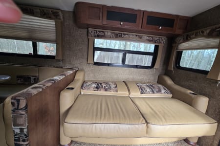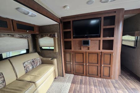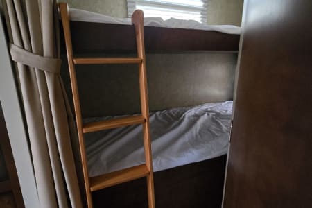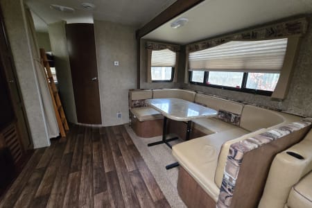 Private queen bed area, TV, extra big dining table seating, couch that easily pulls into bed, 2 bunk beds, big size stand up shower