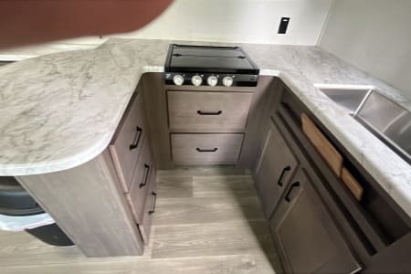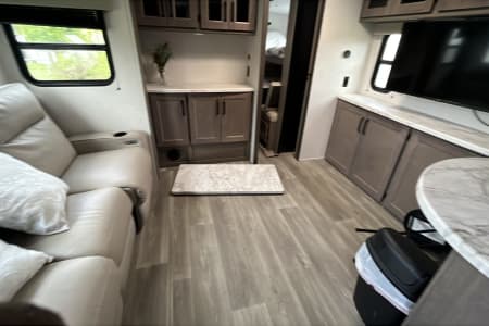 The bright, open living area features a comfortable sofa, a dinette that converts into a bed, and large windows that bring in natural light. The fully equipped kitchen includes pots and pans, dishes, utensils, and a coffee maker. We also include cleaning supplies, RV-safe toilet paper, and septic tabs.
