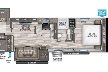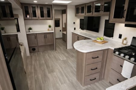 Jupiter features a spacious bathroom with a full-size shower, toilet, and sink, giving you residential-style comfort without relying on campground facilities. RV-safe toilet paper and septic tabs are provided for your convenience.