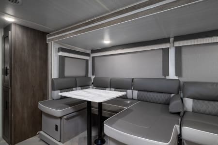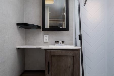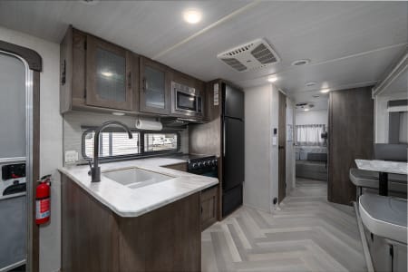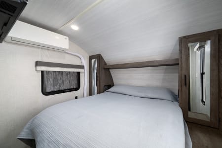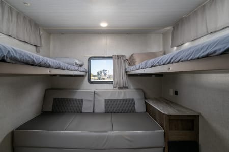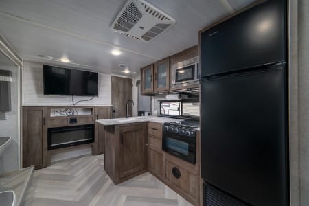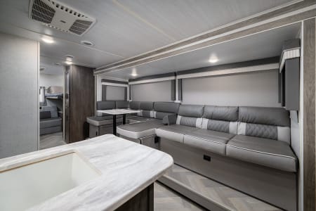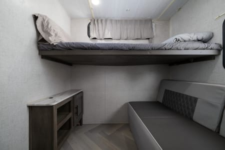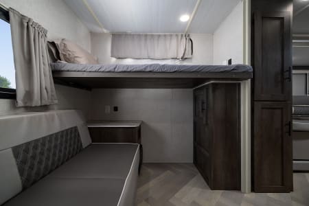 Step inside, and you’re welcomed by a warm, thoughtfully appointed interior: a spacious super slide-out expands the living area, a plush fold-out sofa and convertible dinette provide versatile seating and sleeping, twin bunk beds offer cozy quarters for younger campers, and a Smart TV mounted above an electric fireplace sets the perfect evening ambiance. A single, well-placed entry door ensures easy access, while the private master suite—with its luxurious queen bed—serves as a serene retreat after a full day on the trail.