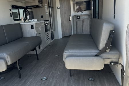 • Fully stocked kitchen: 14 cu ft 12V fridge, 3-burner stove/oven, microwave, Updated contemporary kitchen sink.