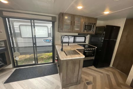 The living area is great for hanging out after a long day, and the kitchen makes it easy to cook meals just like at home. You’ll also have a private bedroom for quiet nights and a full bathroom with a shower, so you’re not giving up comfort while camping.