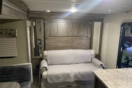 Camper has a queen size Murphy bed in the front, that folds up to allow the sofa to be used during the day, twin size bunk beds in the rear, a dinette that folds to about a twin size bed. Camper comes stocked with basic kitchenware, (cups, dishes, silverware, utensils, coffee pot, and a few pans) TV, stereo, AC, propane heater, and propane water heater.