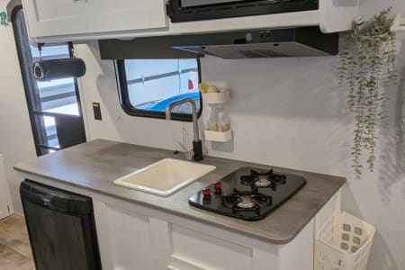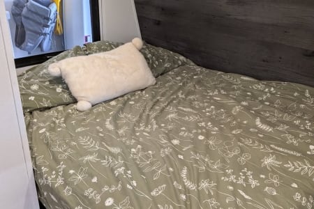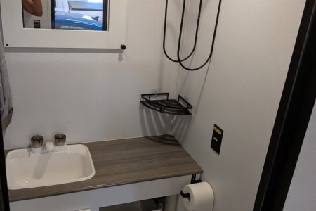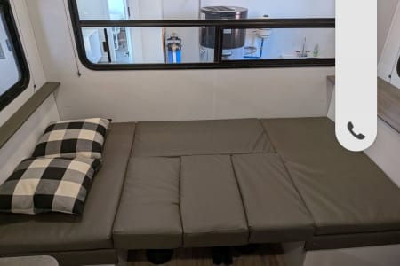 Make this beauty the Basecamp for your Moab or 4-corners Adventure! Main bed is a super comfy Queen, and the dining room table fits a cozy 6 for coffee in the morning and turns into a bed that can fit another big guy, a cozy couple or 3 small kids, all up to you. Has a fairly roomy shower with hot water, toilet, and bathroom sink. Kitchen has a 2 burner stove, and microwave and A/C if you are plugged in. A nice size counter with a sink. Propane fridge and solar power with battery,. Has Powered awning for shade and comes with 2 hammock stands and a few campsite games.