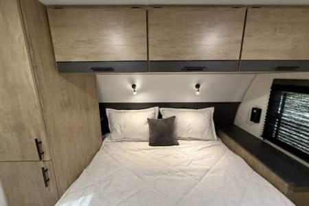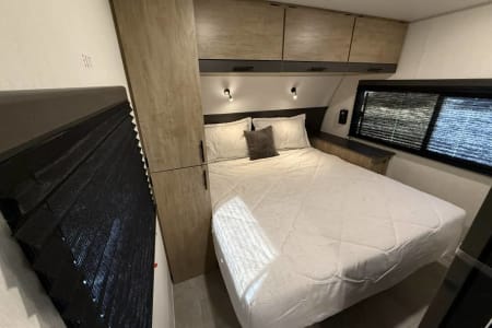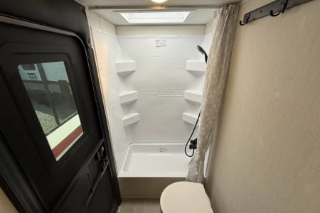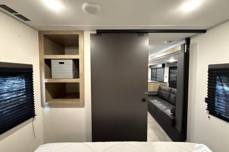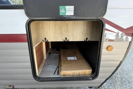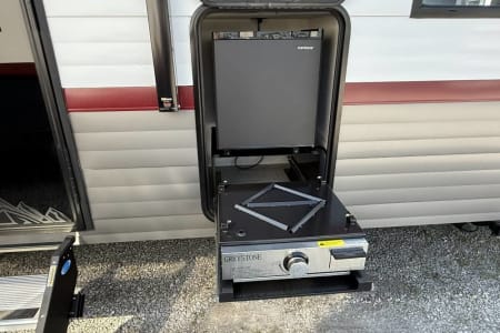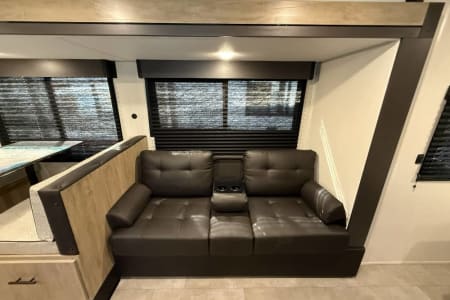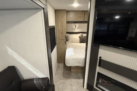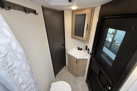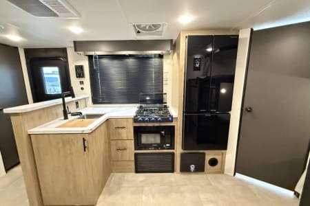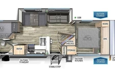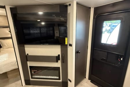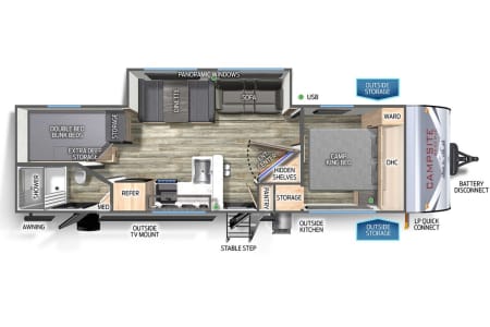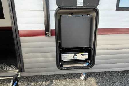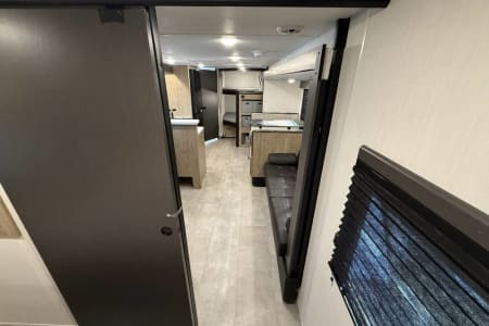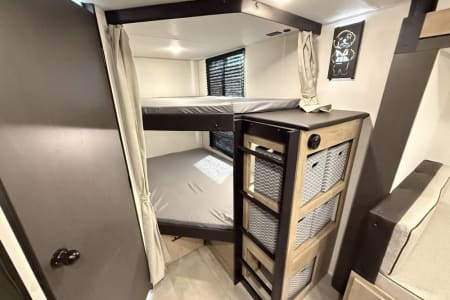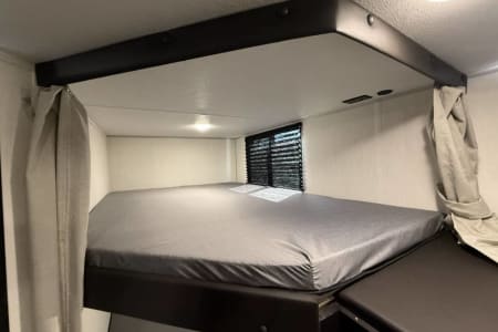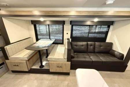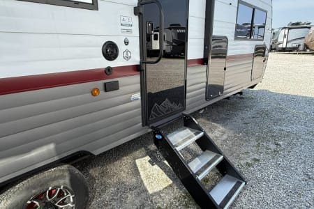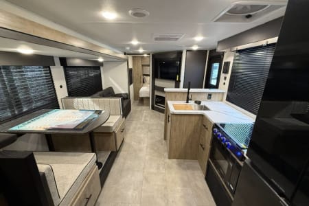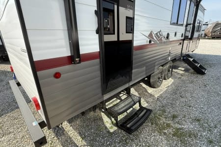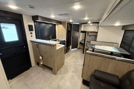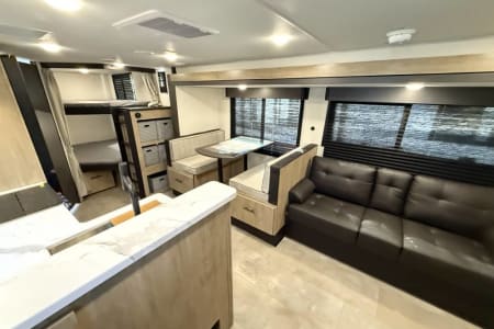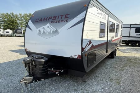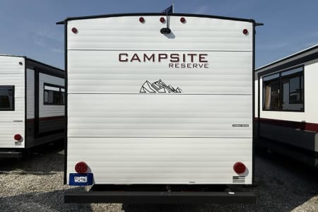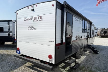 Try our brand new 2026 Forest River Campsite Reserve 26CJ. This open floorplan bunkhouse can have nine sleepers (8 adults and 1 child). You’ll have everything you need to make your this camping trip dreamy and comfortable. Enjoy the nature around you when you look through its big privacy glass windows, including a massive square window in the kitchen while keeping your privacy. hidden pantry; microwave/air fryer; built-in electric fireplace to enjoy on rainy cool days; tankless water heater; Bluetooth AC with dehumidifier; NextGen stabilizer jacks; outdoor shower, outdoor kitchen and fabulous awning to shield you from the sun, a separate entrance to the bathroom to clean up before entering the main area, if needed.