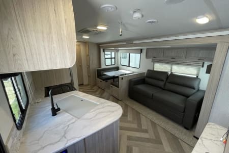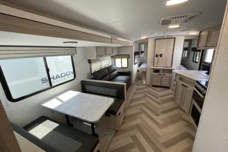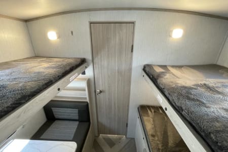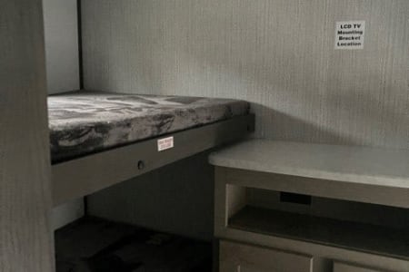 We love the great outdoors and this camper is perfect for those families that like to get away from the busy city life to spend some quality time together. This is a Quad bunkhouse model! It has one large slide. This unit has a small dinette in the back for the kids to play games. Outside kitchen makes hanging under the awning fun! Plus the Smart 40 in LED TV and DVD player is great for movie time if you have a rain delay in your family fun time. It is extremely lite weight coming in at 5930 lbs. Two AC Units. Making this unit 1/2 Ton towable, and for your safety we provide a equalizer antisway hitch. Sleeps 10.