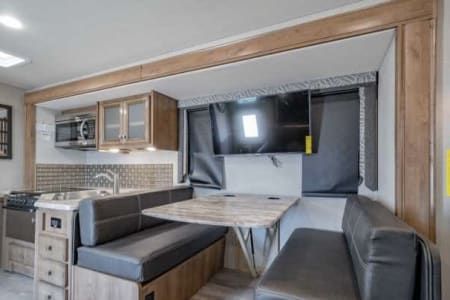 The single slide-out expands the living area, creating a bright and open interior. This RV sleeps up to 4 guests, featuring a rear queen bed, a convertible dinette, and comfortable seating throughout.