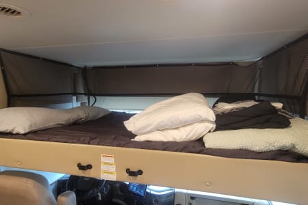 Ample Sleeping Spaces: Accommodating up to eight people, the RV includes a king-size bed in the master suite, bunk beds, a queen-size bed over the cab, and a convertible dinette bed, offering versatile and comfortable sleeping options for everyone.