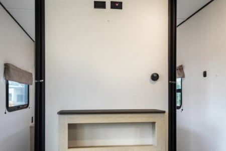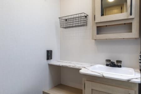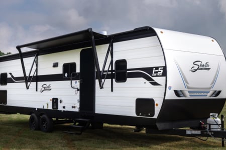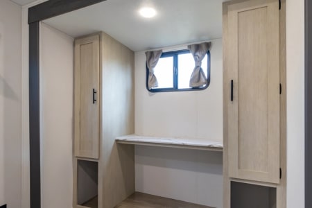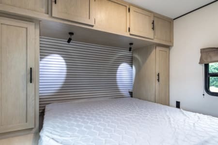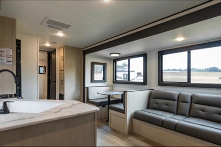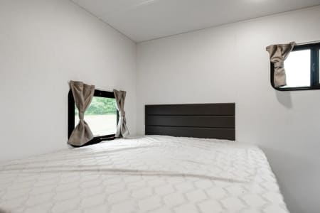 This unit has 2 bedrooms. One in the front of the unit and one in the rear of the unit. The front bedroom has a queen bed and the rear bedroom has a full sized bed. All of our units come with most of what you will need for a nice getaway. Bedding is supplied for all the beds (couch and dinette not included). We do NOT supply pillows. In the bathroom you will find bath towels, hand towels, first aid kit, hand soap, and 2 rolls of toilet paper. For the kitchen we have pots, pan, cooking utensils (spatula, tongs, can opener, etc), dish soap, plated, bowls, cups, Baking dish, cooking sheet, coffee maker and coffee filters ( coffee not supplied), and a toaster. There is a 32 inch tv in the main living area. For the outside compartment there is 4 outdoor chairs, outdoor rug, sewer hookups and leveling blocks.