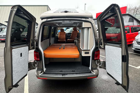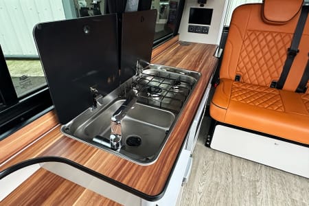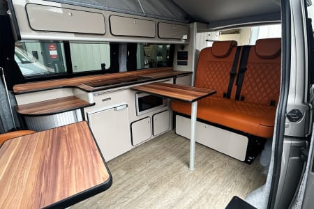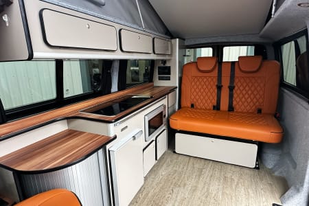 And when it comes to mealtimes, you’re properly covered: the Highland Explorer has an inbuilt microwave for quick, easy food on the go, plus an internal gas hob for cooking inside the van when the weather isn’t playing ball. If you’re heading to a campsite, it’s just as at home there too — with the option to add a pop-up tent, you can create even more sleeping space and flexibility, perfect for kids, extra guests, or simply spreading out a bit more.