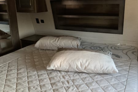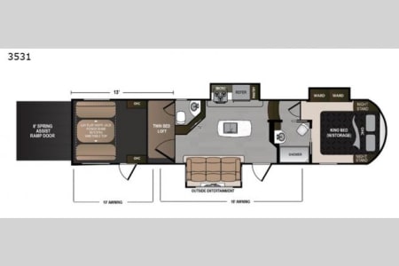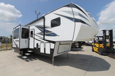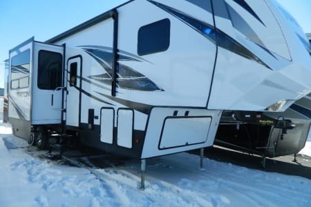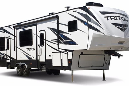 Fifth wheel toy hauler with a 13ft garage. One full bath. An additional toilet. 3 TVs. Xbox optional. Built in generator with 30 gallon fuel tanks, at hourly charge. Bring you’re ATV, UTV or Dirt bikes along on you’re camping trip. Can haul a ride up to 13ft long by 5ft 6 inches wide. Cant taller the 6ft 7inches. Has a upstairs loft. This RV sleeps 7-8 people. I’ve estimated generator runs 0.6 of a gallon a hour at half load.