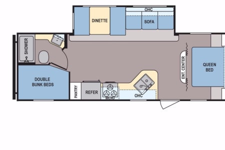 Sleeping: Has 5 beds. A queen master bed, 2 full size bunks, futon couch, and convertible dinette.