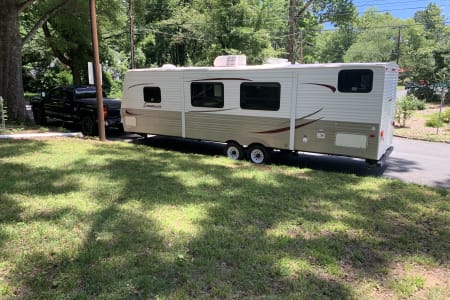 Our 32ft bumper pull camper has two sets of bunk beds in the back for a total of 4 twin beds as well as the queen bed at the front. It is loaded with all the cookware and dinnerware you would need, we just ask that you please provide your own linen due to COVID.