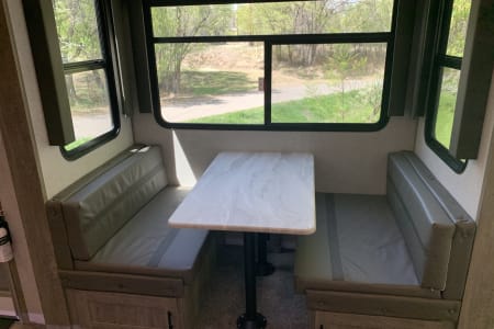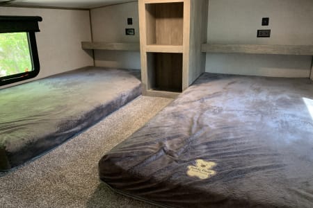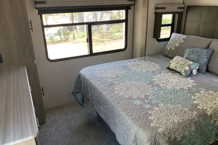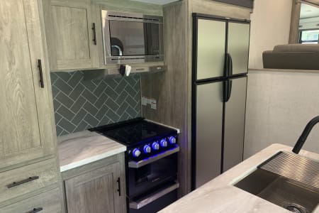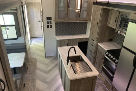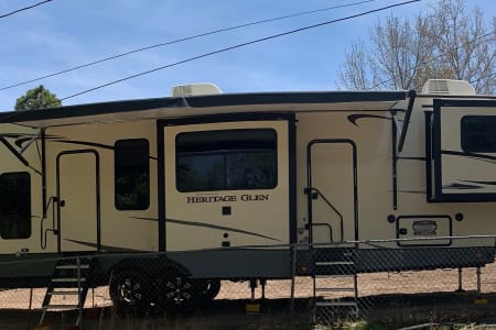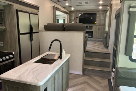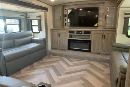 2021 luxurious fifth wheel front living room camper with 5 slide outs. 1 bathroom. 1 king bed, loft area, and 2 pull out sofas. Electric awning, auto level package, 4 door refrigerator (gas or electric) fireplace, TV and outdoor sound system. We have a generator for dry camping as well.