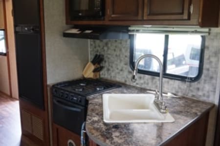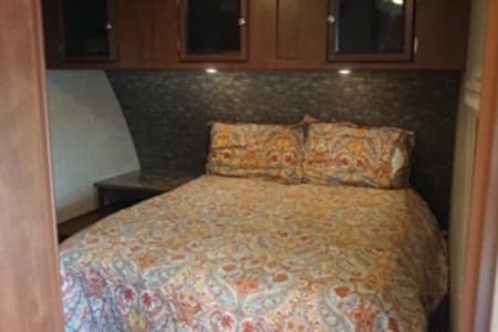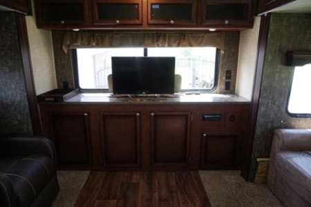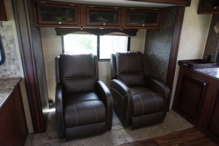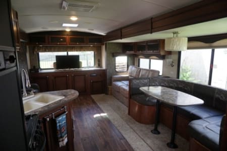 Great family ready camper suited for a long vacation, tailgating/cookouts or a weekend get away. Master bedroom up front offers plenty of privacy with queen sized bed and full slide out closet and overhead storage. Roomy bathroom with full size stand up shower. Large rear living area with Two leather recliners and full sleeper sofa. Recliner area can be converted to accommodate addition sleeping space upon request. Lots of large windows and sky lights with rear entertainment center with hideaway 32'' flat screen TV. Booth style dinner table provides plenty space of for the whole family. Table folds down to provide additional sleeping space and lots of overhead storage. 18' electric awning with integrated LED lighting. Outdoor audio system. Bed coverings, towels, cleaning supplies and toiletries and cooking supplies are provided to allow for the most enjoyable and convenient experience possible. The camper is equipped with a wide stance dual axle and is easily towed with a half ton Pickup. 30 AMP electrical. The camper has been very well kept and rarely used. Tires are n perfect condition and the exterior is free of defects. Delivery/setup and pickup/teardown option is available for additional charge with in 50 miles of the Houston area subject to additional mileage charge beyond that. 2 Night Minimum.