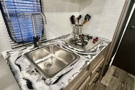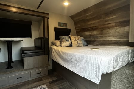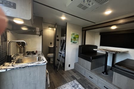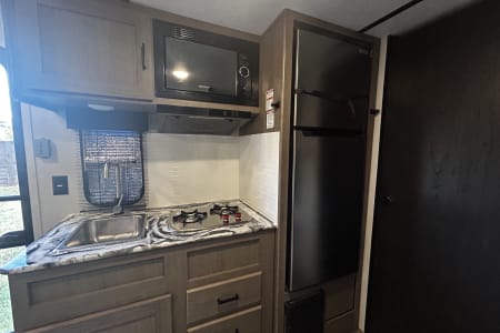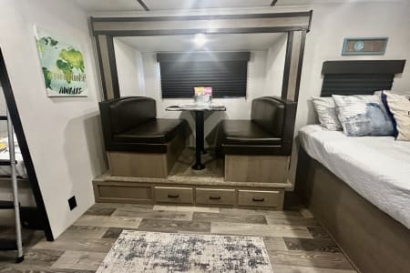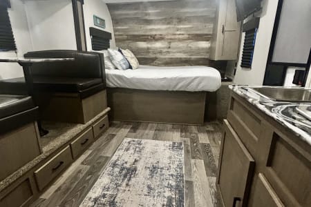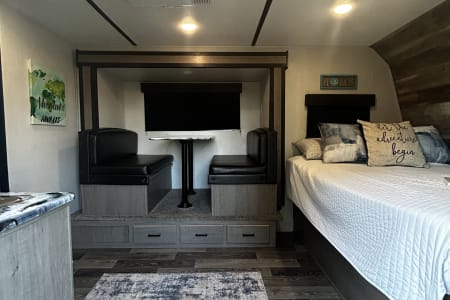 Gilligan's Island "Mary Ann" is a 2021 Keystone Hideout with 1 slide, 17.6 ft. Lightweight easy to tow. Nicely set up for you with all the extra necessary items, coffee maker, toaster, crockpot, cookware, linens, 6 bath towels/4 hand towels/6 wash clothes, 4 camp chairs, trash containers, cleaning supplies provided. Portable Bluetooth FM/Speaker unit. Good size refrigerator/freezer, 2 propane burner cooktop, microwave, Smart TV with ROKU, USB ports, Keyless Entry, Exterior LED lights, plenty of storage underneath the queen bed & pass through. Shower, bath sink & commode. Easily can sleep 5-6 comfortably. 1 Queen bed, 2 Twin bunks + Dining table conversion/sleep area. All you need is your clothes, food, beverages & destination. Mary Ann is a super cute unit with some extra interior space with the slide.