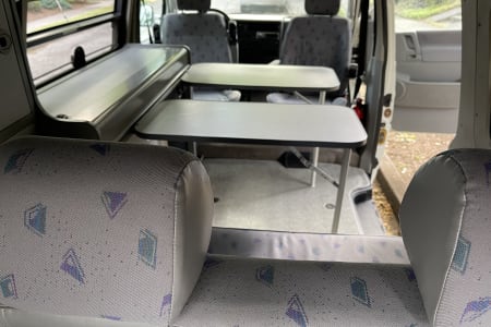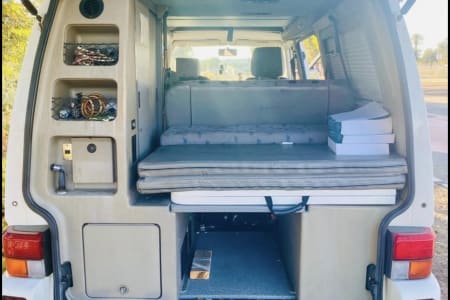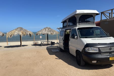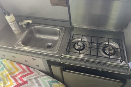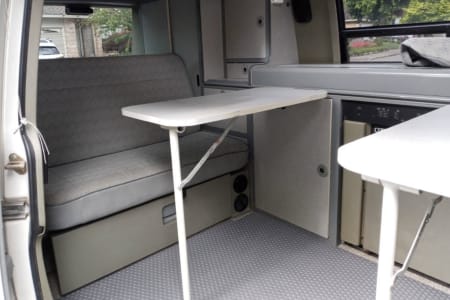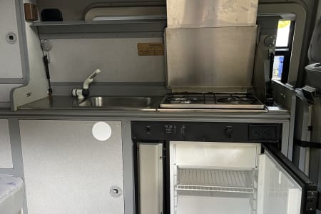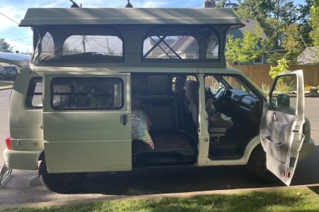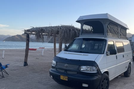 Kaya is a full VW Eurovan camper including a sink, two burner gas stove, three way refrigerator, outdoor shower, fresh and gray water tanks. Propane heater etc.