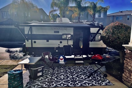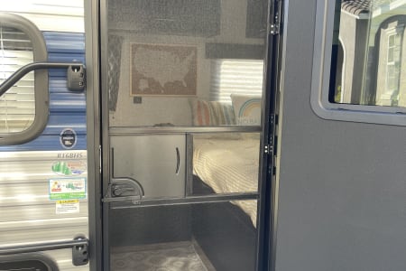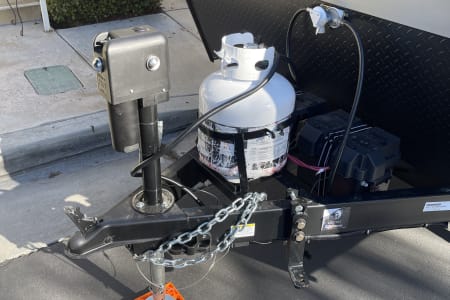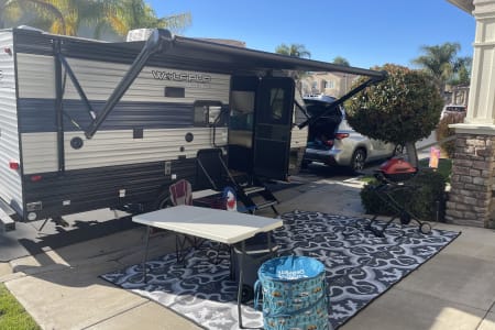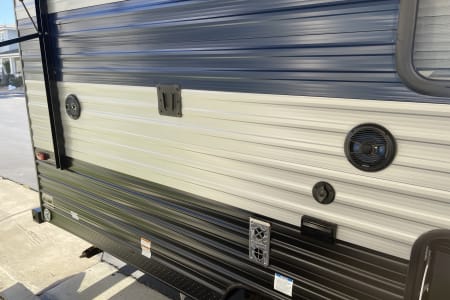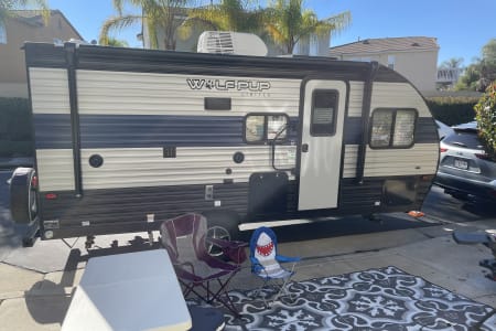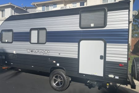 This WolfPup has all the bells and whistles. Large queen bed, bunkbeds, and the dinette folds out to a full-size bed. Air-conditioner (with electric hookup) heater (runs on propane) water heater, fan in bathroom, ventilation, Bluetooth, Large refrigerator inside, mini fridge outside, indoor shower and toilet, outdoor shower, indoor and outdoor speakers, electric awning with LED lights, and much much more!
