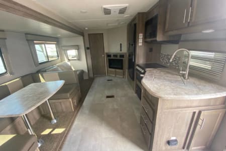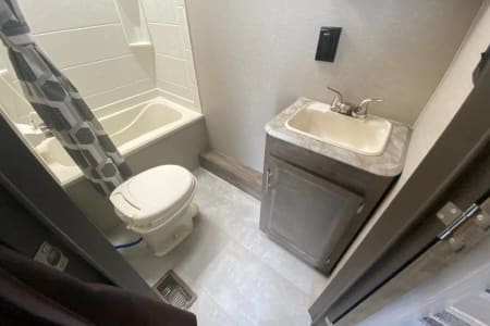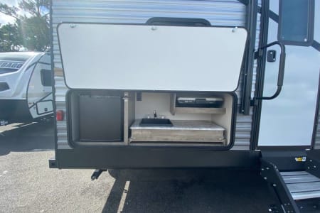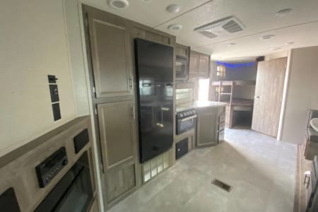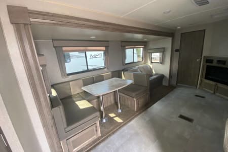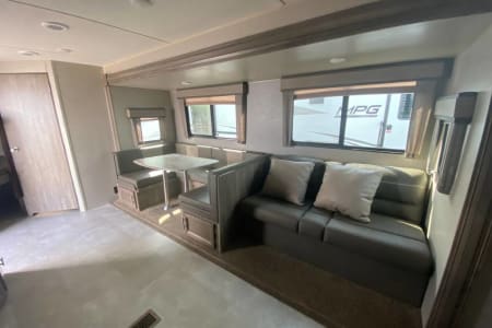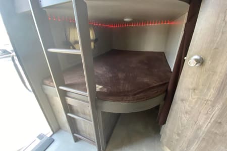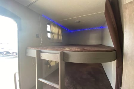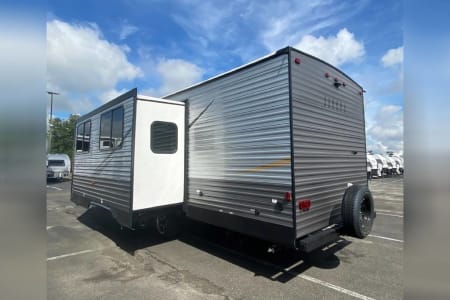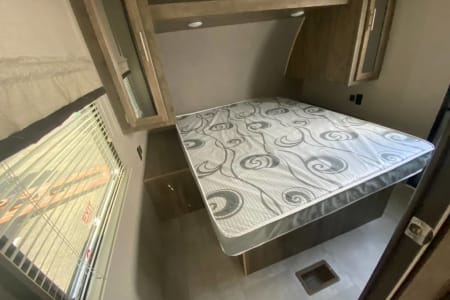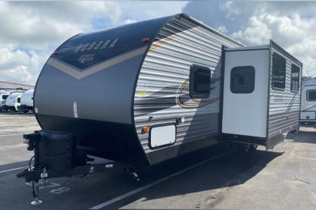 This RV is perfect for mid to large families. This is a bunk house trailer that can sleep 6 to 8 people. This unit is 31 ft long and weights 6,300 lbs. The hitch weight is around 730 lbs. This unit can be towed behind any full size pick up. We provide a weight distribution kit with sway control with this rental. We also provide 20 foot sewer hose, 2 water hoses, 50amp to 30 amp converter, broom, trash can, floor mats and toilet paper to get you going.