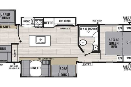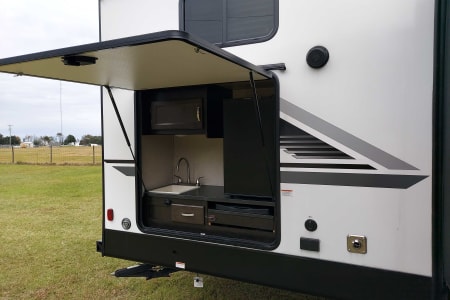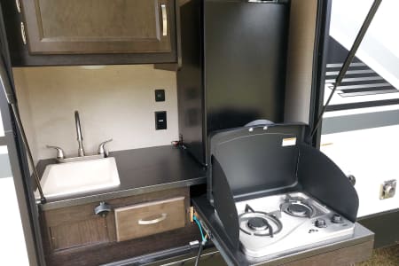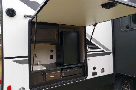 Features a custom and fully equipped living room, kitchen and two bedrooms. Sink, 4 burner stove, microwave, ventilation and heater. Tons of storage space throughout the camper for all of your adventure gear!