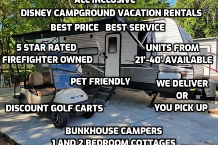WE WILL DELIVER AND SET UP OUR TRAVEL TRAILER CAMPING UNITS TO YOUR LOCATION OR CAMPSITE...OR...WE WILL SET UP ON A CAMPSITE AT MILL CREEK RESORT IN KISSIMMEE FL. 34744