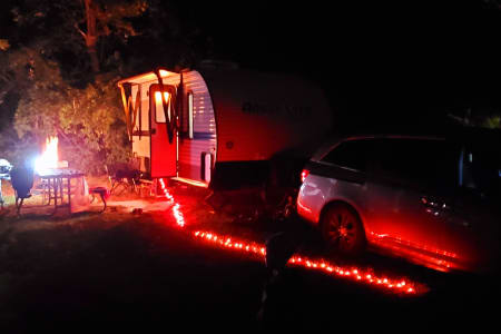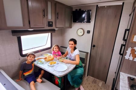 The RV is a 2021 ultra lite (20ft long, 3000lbs dry weight) easy to pull with almost any SUV or minivan with a minimum towing capacity of 3500lbs and can accommodate up to 4 people (2 adults & 2 kids or 3 adults).