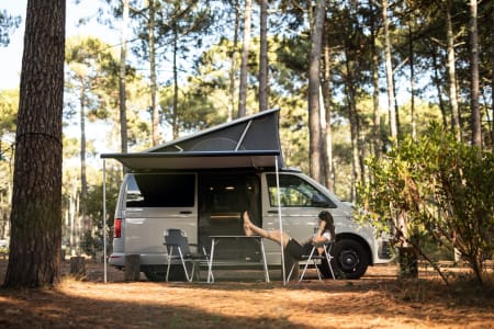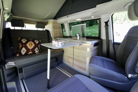 Outside the vehicle there is a wind out, side awning that creates a cosy space. The van is supplied with 2 and complementary chairs and a table that can be used inside or out.