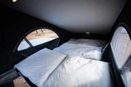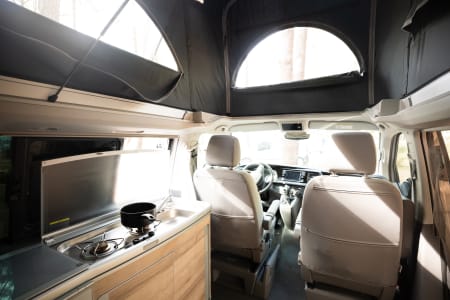 The elevated roof offers comfort in a small space, it’s easy to use and give you more space to move around the passenger area. When night time comes, the elevated roof becomes a 2-berth sleeping area. The bench seat also folds down and makes a comfortable bed for two in the rear of the van.