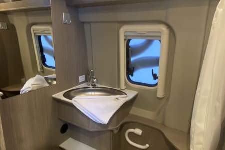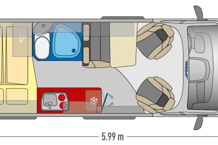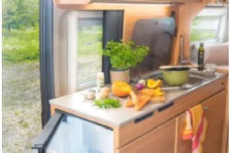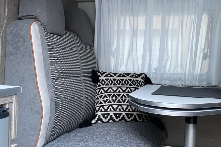 Côté cuisine, le grand réfrigérateur (avec freezer) de 100 L astucieux s’ouvre des deux côtés : soit vers l’intérieur, soit vers l’extérieur, pratique si vous préparez à manger dehors. A l’intérieur l’espace repas permet de manger à 4 grâce aux sièges avant qui pivotent.