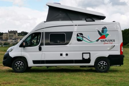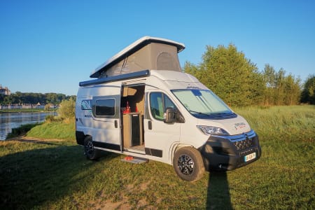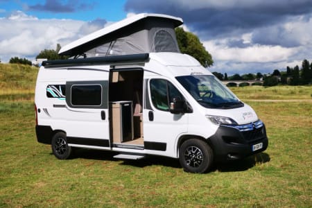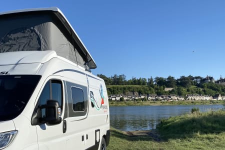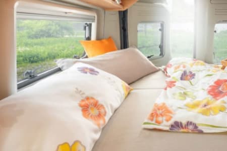 Côté couchage, le lit arrière est spacieux, vous disposez également d’un dressing et de nombreux rangements. Son toit relevable avec fenêtres permet de loger deux autres personnes.