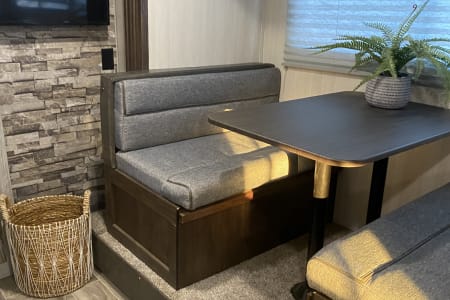 Don’t let the size fool you! This amazing trailer has room for everyone! With a queen bed, a fold out couch with a bunk bed that folds out, and a dinette conversion the whole family can sleep great in the peace of camping. At 22 feet and a light weight of 3800 pounds this trailer is easy to pull with almost any truck or SUV. This trailer has all the comforts of home with bathroom, fridge and freeze, tv that can be moved outside for movie night, two burner stove, hot water heater, AC and heat, Bluetooth stereo with inside and outside speakers, and LED lights throughout the trailer. The outside shower is awesome for the quick rinse of sand from the beach or lake! If you are dry camping the trailer has a fresh water tank of 32 gallons! Black and grey water are 23 gallons each.