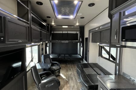 This Toy Hauler is equipped with an 2000 watt inverter, two televisions inside and one outside, and a fueling station for all of your toys. This rig also is equipped with solar panels to charge the batteries, and a quiet 5500 watt onboard generator to power the trailer.